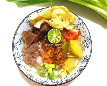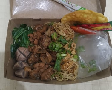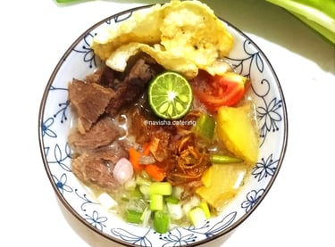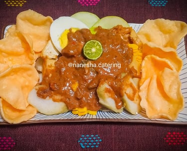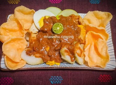 Nasi Putih, Olahan Daging Sapi, Buah, Gulai, Sambel, Telor Pindang, Bihun goreng