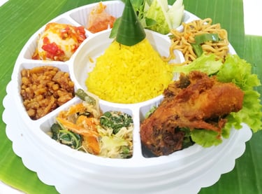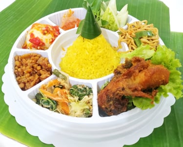 Nasi Kuning, Ayam Goreng, Mie Goreng, Sambel, Tempe Orek, Lalapan (Garnish)