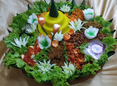 Nasi Kuning, Ayam Goreng, Sambel Goreng, Mie Goreng, Tempe Orek+ Teri+Kacang Tanah, Sambelan Kentang + Ati Sapi, Telor Balado, Urap, Lalapan (Garnish), 1 set Alat Makan, Pisau Plastik, dan Centong Nasi