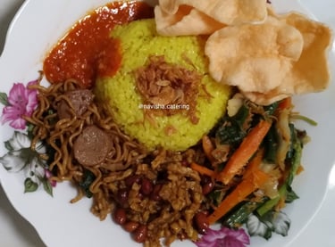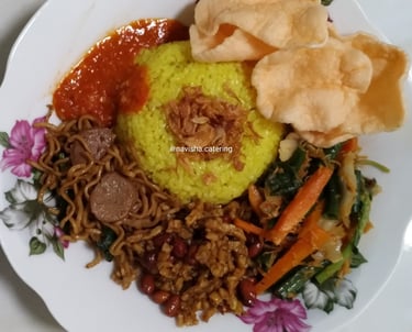 Nasi Kuning, Orek Tempe, Urap, Sambel, Kerupuk, Mie/Bihun Goreng