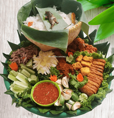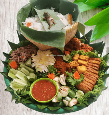 Nasi Liwet Gurih, Ikan Asin Peda 1 Ekor, Lalapan, Tumis Cumi, Ayam Goreng, Tahu Goreng/ Bakwan Jagung (pilih 1), Tempe Goreng/ Bakwan Jagung (pilih 1), Sambel Khas Nasi Liwet, Jengkol Sambel Jurig, Centong & Bakul, 10 Set Alat Makan/Daun.